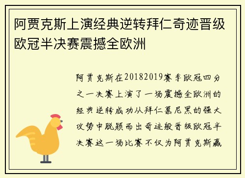 阿贾克斯在2018-2019赛季欧冠四分之一决赛上演了一场震撼全欧洲的经典逆转,成功从拜仁慕尼黑的强大攻势中脱颖而出,奇迹般晋级欧冠半决赛。这一场比赛不仅为阿贾克斯赢得了历史性的一刻,也让整个欧洲足坛为之一震。本文将从四个方面详细阐述这场比...
