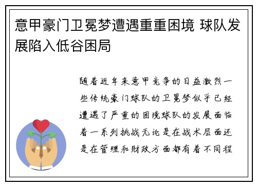 意甲豪门卫冕梦遭遇重重困境 球队发展陷入低谷困局
