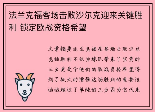文章摘要:法兰克福在客场击败沙尔克的胜利,不仅为球队带来了宝贵的三分,更是令他们的欧战资格希望得到了极大的增强。这场胜利的重要性,远远超过了单纯的三分,因为它代表着法兰克福在竞争激烈的联赛中占据了更有利的位置。本文将从四个方面详细分析法兰克...