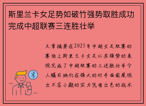 文章摘要:在2025年,中超女足联赛的赛场上,斯里兰卡女足以其强势的表现,完成了中超联赛的三连胜壮举,令人瞩目。她们在强大的对手面前展现出不容小觑的实力,凭借出色的战术安排和团队协作,在比赛中展现出令人惊叹的攻防能力。这一成就不仅体现了斯里...